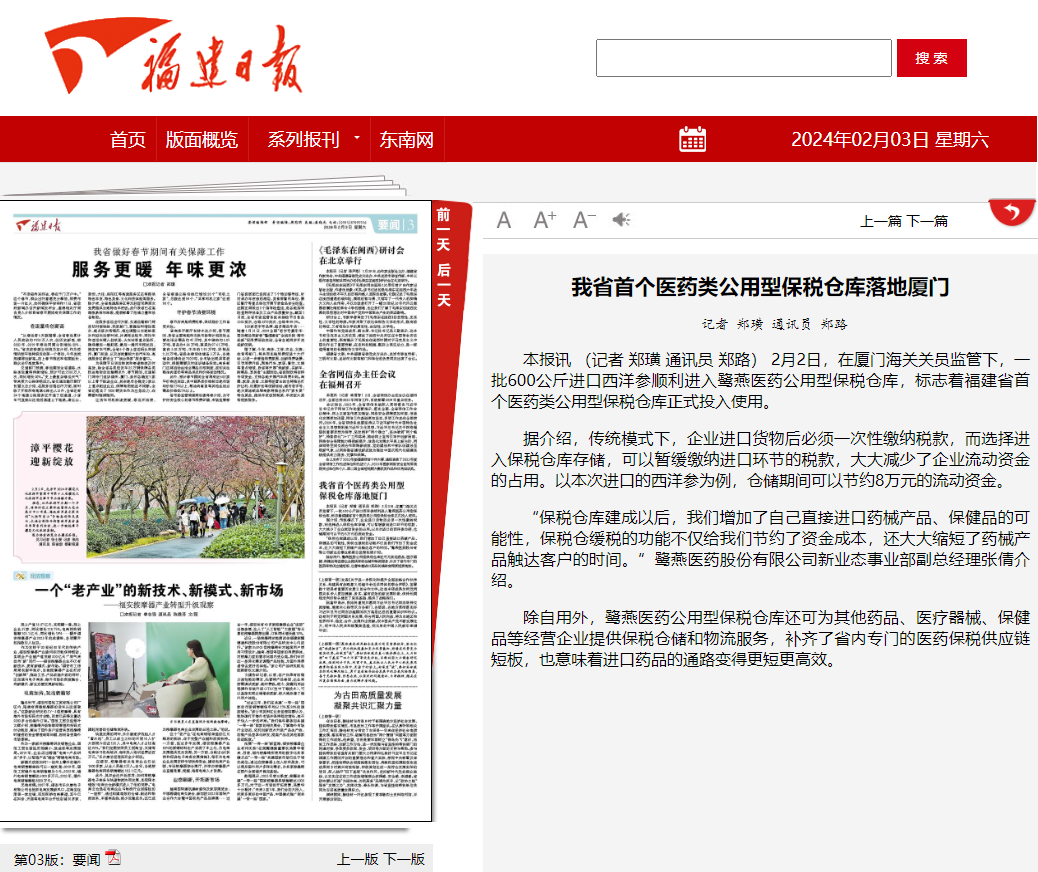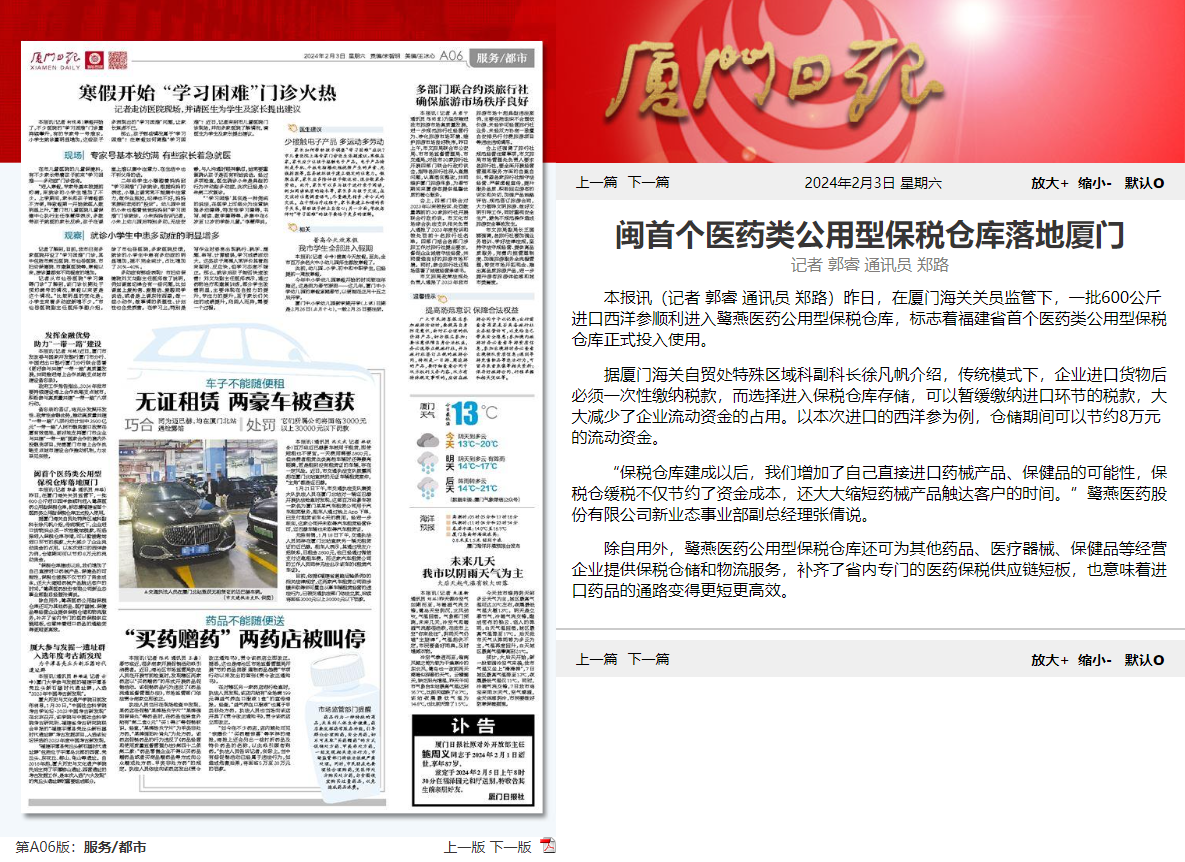 2024年2月2日,鷺燕醫(yī)藥公用型保稅倉(cāng)獲批投用,《福建日?qǐng)?bào)》《廈門(mén)日?qǐng)?bào)》相繼報(bào)道相關(guān)新聞。鷺燕醫(yī)藥公用型保稅倉(cāng)是福建省首個(gè)醫(yī)藥類(lèi)公用型保稅倉(cāng)庫(kù),該保稅倉(cāng)庫(kù)的投用,意味著廈門(mén)市乃至福建省補(bǔ)齊了區(qū)域內(nèi)專(zhuān)門(mén)的醫(yī)藥保稅供應(yīng)鏈物流服務(wù),也意味著廈門(mén)和福建進(jìn)口藥品的通路變得更短,更為高效。