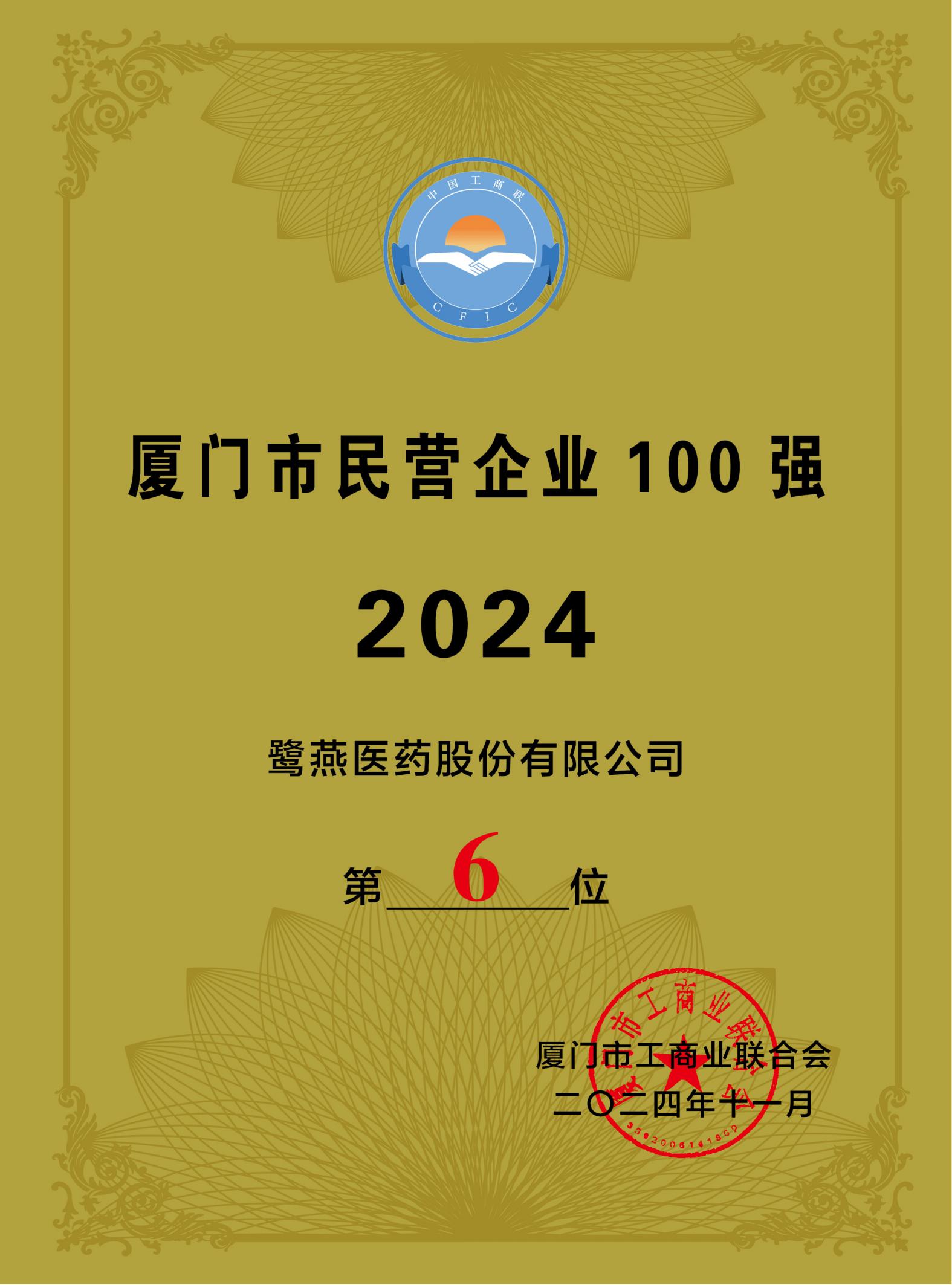2024年廈門企業(yè)家日大會(huì)于11月1日召開,會(huì)上發(fā)布2024廈門市民營(yíng)企業(yè)100強(qiáng)榜單、2024廈門市民營(yíng)企業(yè)服務(wù)業(yè)20強(qiáng)榜單。鷺燕醫(yī)藥榮登2024廈門市民營(yíng)企業(yè)100強(qiáng)榜單第6位,2024廈門市民營(yíng)企業(yè)服務(wù)業(yè)20強(qiáng)榜單第4位!