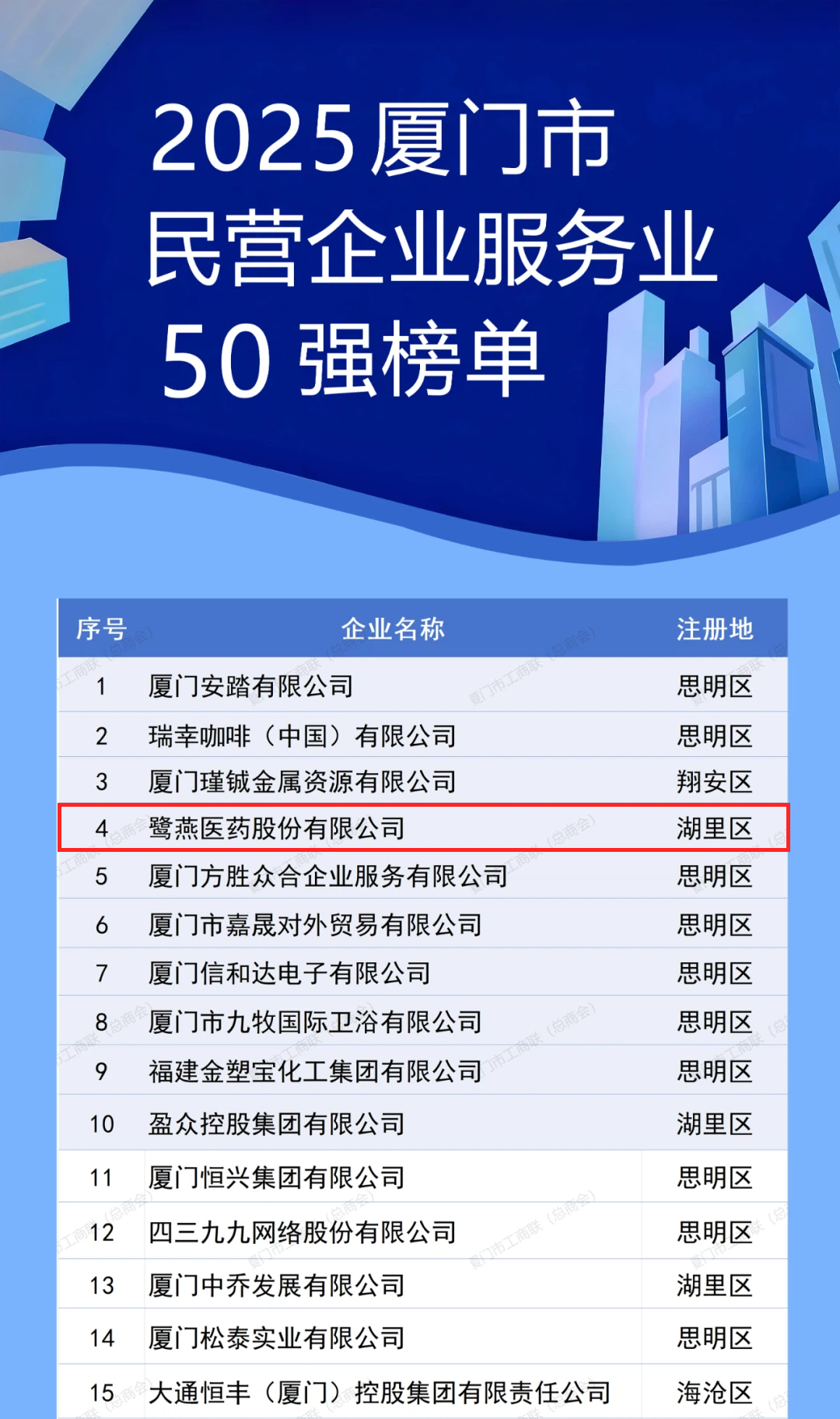 11月1日上午,2025年廈門企業(yè)家日大會召開。大會發(fā)布了2025廈門市民營企業(yè)100強(qiáng)系列榜單,介紹了廈門市民營經(jīng)濟(jì)發(fā)展態(tài)勢和營商環(huán)境建設(shè)成效。鷺燕醫(yī)藥股份有限公司憑借上市企業(yè)綜合實(shí)力,榮膺“2025廈門市民營企業(yè)100強(qiáng)”第6位,以及“2025廈門市民營企業(yè)服務(wù)業(yè)50強(qiáng)”第4位。